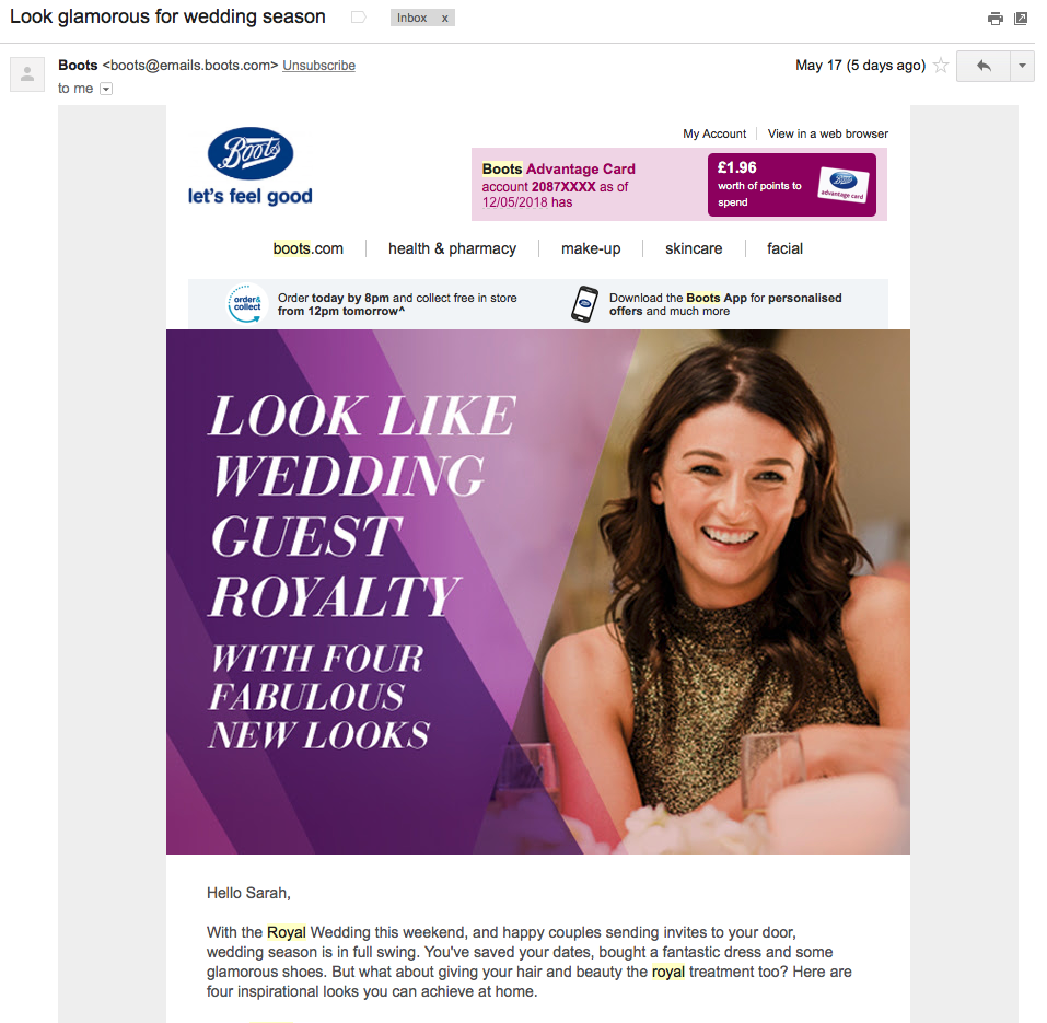 Finding a way to relate to users and tug at emotions is also a good way to cut through the noise. MissGuided capitalized on their audience’s potential FOMO by offering a 20% discount code as a consolation to everyone wishing they’d received an invite to the main event. And even if you weren’t envying the guests, who doesn’t like a discount? Boots invited customers to think ahead to weddings they were invited to, reminding them to think about the beauty supplies they might need to stock up on now.