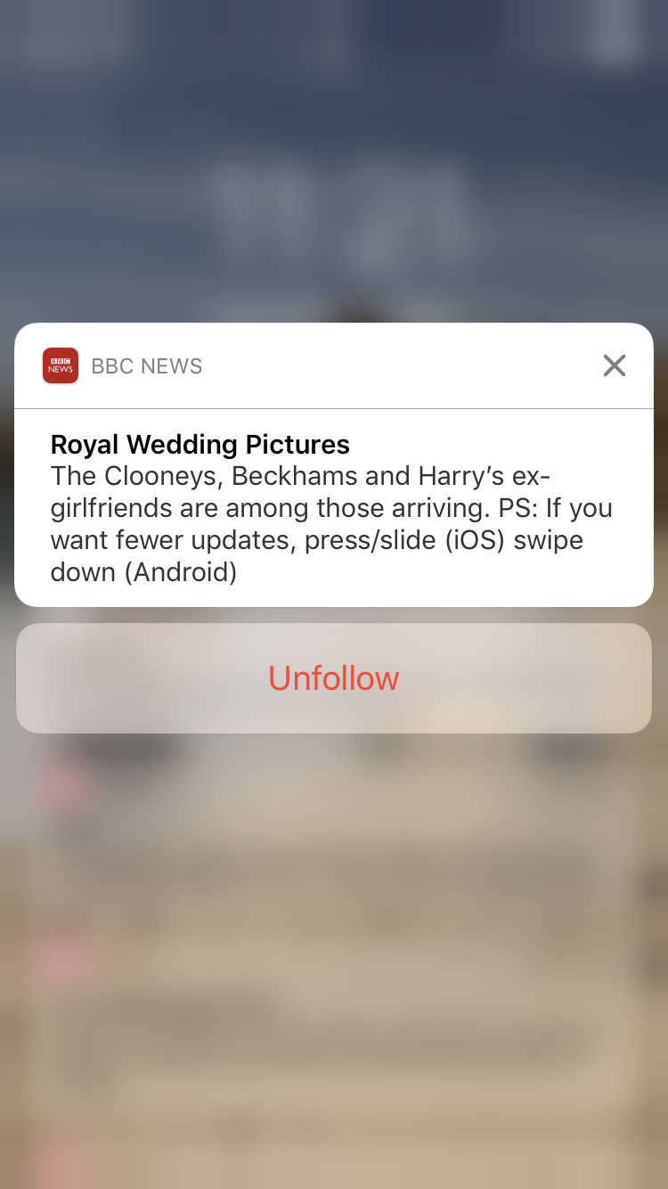 The BBC stood out amongst the crowd by putting the power into their user’s hands. Their unique approach leveraged interactive rich notifications to invite users to opt in or out of further news. Even if a user said “Yes” they were given the option after every notification to “unfollow” the news altogether should their interest decline. This strategy prevented annoyance while giving those interested in more exactly what they wanted to hear.