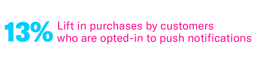 Customers who are opted-in to push notifications have a 13% lift in purchases compared to opted-out customers.  As an example, let’s say your app has 10M purchases and 60% of  purchases come from opted-in customers.  At an average order value of $10, opted-in customers represent $20M more value than those who are opted out.