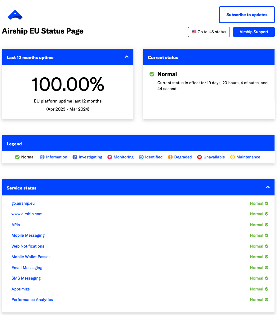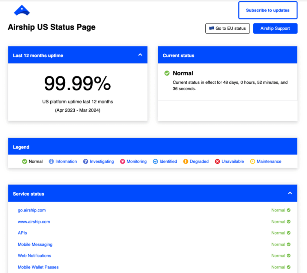 Last year, we upgraded our status page to make it easier for our customers to monitor the Airship services they care about and to be more transparent about our historical uptime. We recognize that when it comes to technology, nothing is foolproof. When it comes to unexpected platform occurrences, we pride ourselves on being quick to the pitch with RCAs (root cause analysis), so you don’t have to wonder what happened.