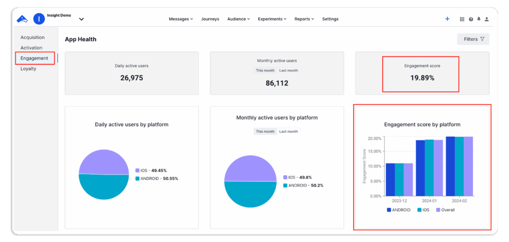Your Engagement Score is your baseline of monthly active users returning on a daily basis. You’ll need to hold your customers’ attention to increase this score. Regularly communicating will build an engagement cadence. Creating compelling content, offers and calls to action will result in app visits.