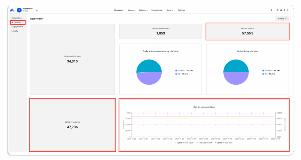 Let’s start by determining how much of the audience is reachable via push notifications. The App Health Dashboard is a great source for this information. It provides an at-a-glance view of your opt-in rate and opted-in audience and how those trend over time.