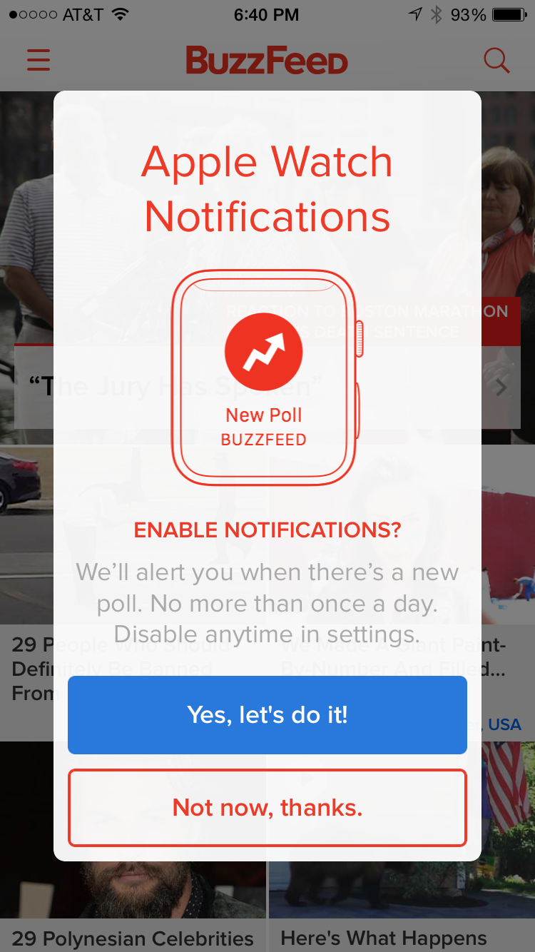 Media company BuzzFeed updated its pre-permission message when the Apple Watch launched. This manages user expectations around volume of messaging, and highlights that users can always opt-out later.