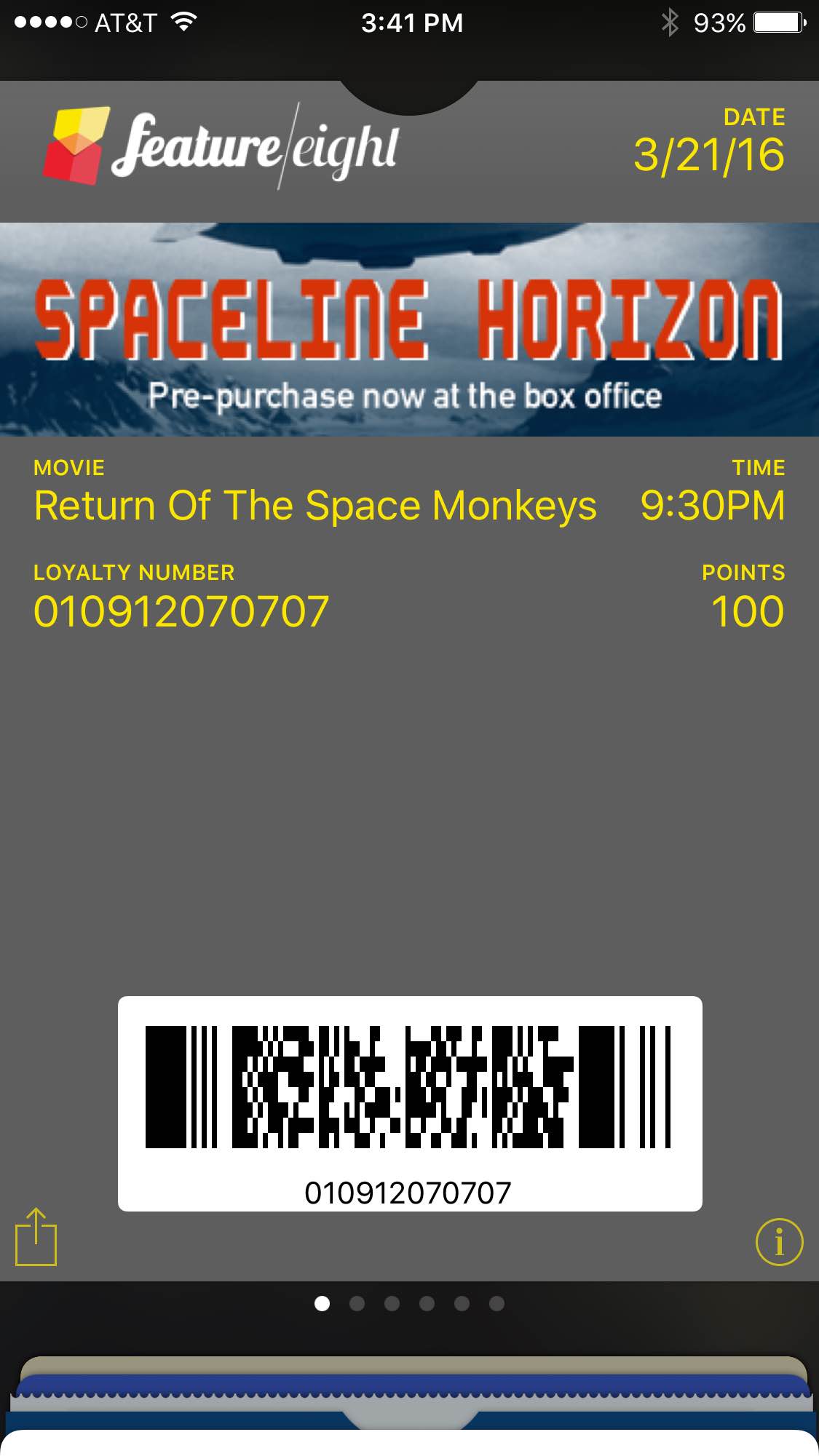 Finally, after the movie ends, the strip image at the top of the mobile ticket can be updated to feature upcoming new releases. As a theater chain, imagine being able to sell that valuable space to studios to promote their upcoming features to millions of mobile ticket pass holders (or targeted groups of them).