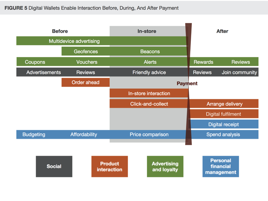 Mobile wallet operators aim to improve shopping for both customers and merchants by integrating features that create new value or deliver greater convenience and a better shopping experience before, during, and after the moment of payment. We love Forrester’s construct for thinking about the types of interactions digital wallets enable throughout the customer journey.