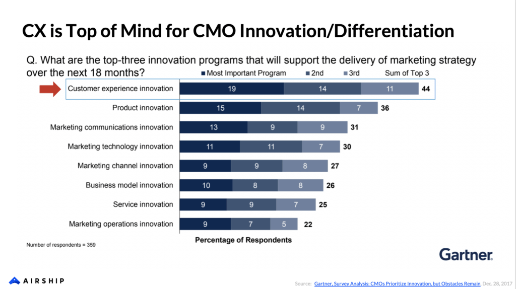 - 44% of CMOs said that customer experience is the most important program they are looking to for driving innovation and differentiation.