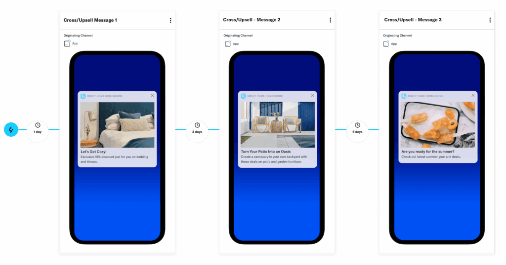 Focusing on repeat purchases is a winning proposition during the growth phase. That’s because existing customers are far more likely to purchase again and again. This journey targets established customers with a series of messages promoting exclusive discounts and complementary products. Here, we’re using Airship Journey’s powerful channel coordination to deliver the messages to the customer’s originating channel — so you know you’re reaching them where they prefer to engage. Plus, with customized offers based on purchase history and preferences, you can provide great CX and even more reasons to convert!