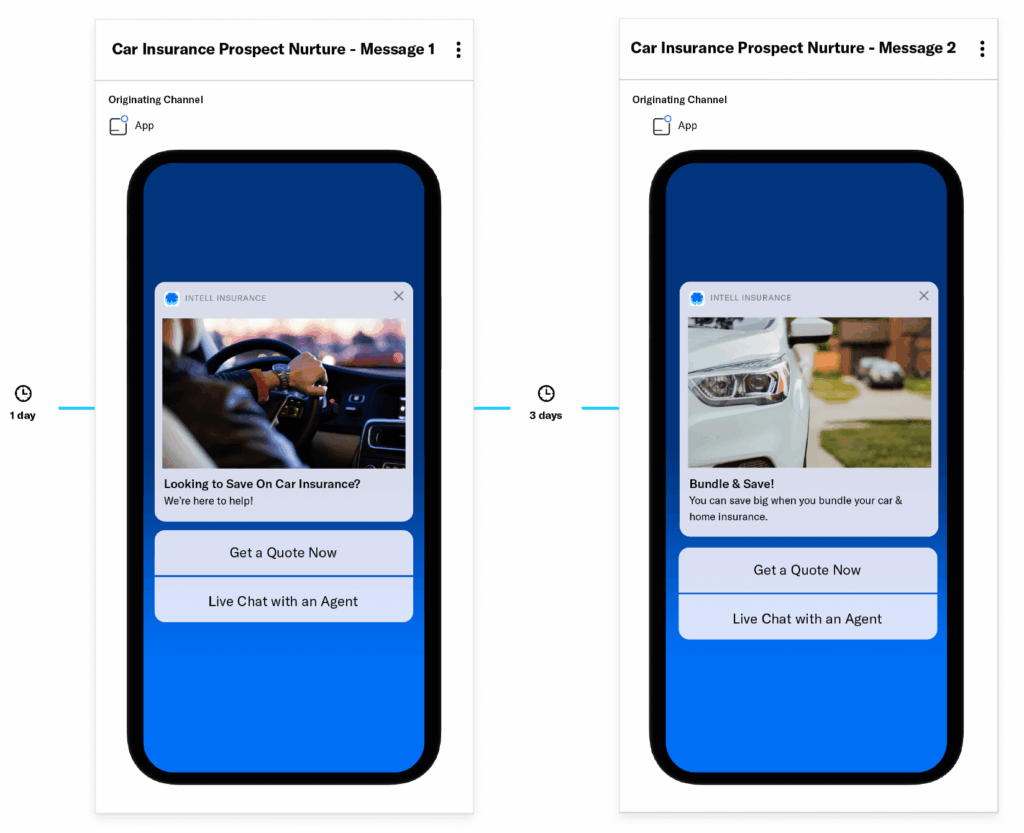 When a customer engages with your mobile app, your brand is top of mind. Leverage that pivotal moment with Airship Journey’s event-based triggers by setting app activity to launch a series of push messages that drive engagement. Use this journey to grow your relationship by promoting valuable offers or features they may not already be aware of. This journey also includes interactive buttons that provide data about customer interactions. And if the customer doesn’t respond to the first message, a follow-up message arrives three days later with additional incentives to get in touch.