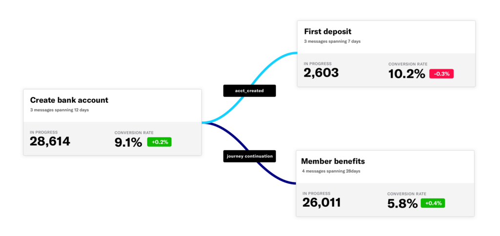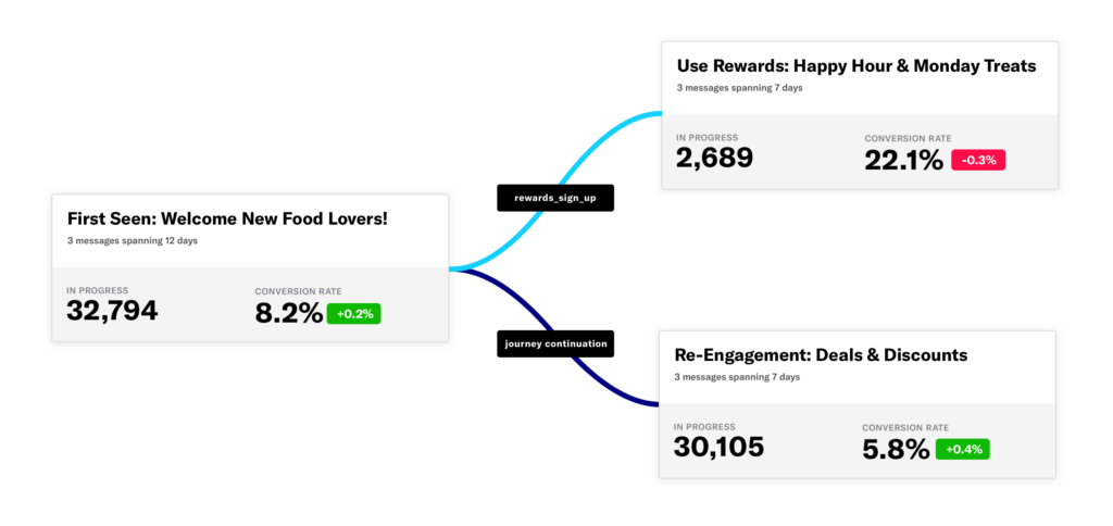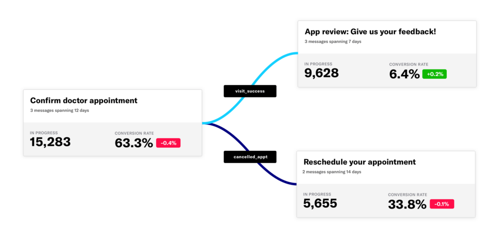 This map view shows the relationship between journeys as well as high level performance metrics, including user flow and conversion rates by milestone. You can also quickly access each underlying Journey for a deeper view of performance metrics by message.