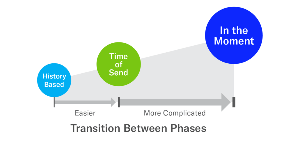 Similar to a brand’s mobile app experience, personalization moves along a maturity curve. We see brands progressing along three key phases: History Based, Time of Send and In the Moment.