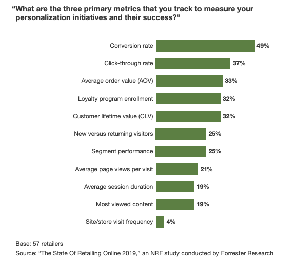 Currently, Forrester reports, “the most frequent metric to measure personalization is site conversion, and the second most frequent is click-through rate.” Given that most retail personalization is focused on websites and email campaigns, this makes sense. But as we go beyond the essentials of customer personalization, our metrics for success—and the valuable, actionable information we get from these channels—expand.