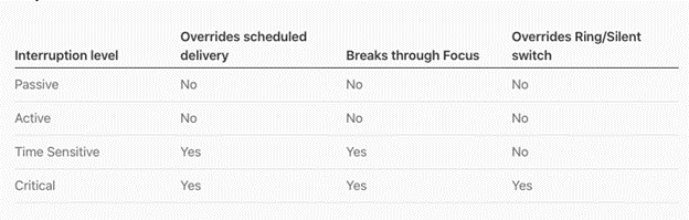 Apple has defined two new types of notifications, Passive and Time-Sensitive, as well as the Interruption Levels API, to give brands controls for nuanced delivery. Only Time-sensitive or Critical Notifications can break through users’ Focus settings to immediately alert them. The latter is extremely rare, requiring special entitlement from Apple for things like health, security and government apps. Time-sensitive notifications are defined as “information that directly impacts the user and requires their immediate attention,” with account security issues or package deliveries provided as examples.