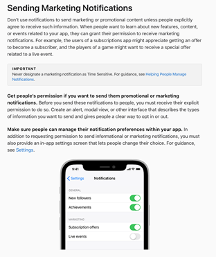 In addition, just last summer, Apple clarified a grey area within its more than a decade-old notification policy, which stated they can’t be used for advertising purposes. This was interpreted as notifications needing to be in-line with the purpose of the app. For example, a pizza ordering app could send opted-in users a special promotion and comply with the policy. Now, however, Apple requires that apps get opt-in permission for marketing messages.