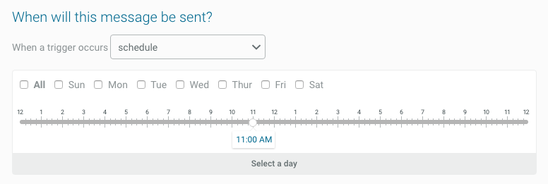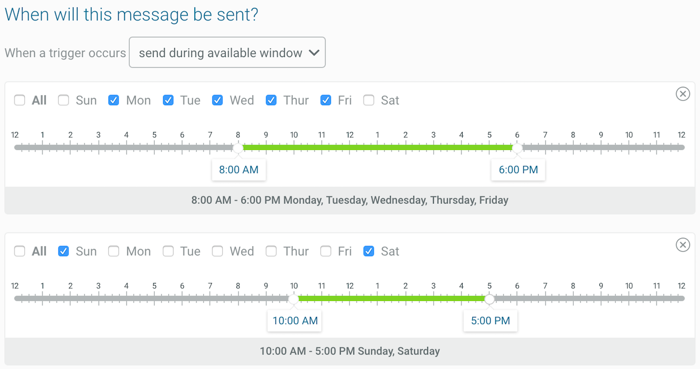 Using our new Message Composer, you can easily define scheduled days and times for message delivery, in this case between 8 a.m.-6 p.m. during weekdays, and perhaps a later start on weekends:
