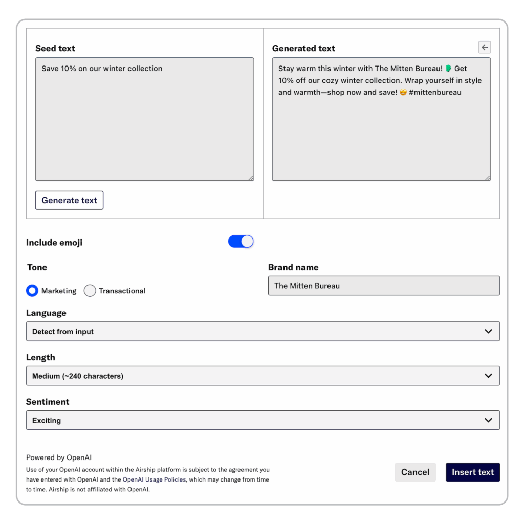 Of course, Airship’s GAI tool supports multiple languages and the ability to leverage emojis (which we know can drive engagement).