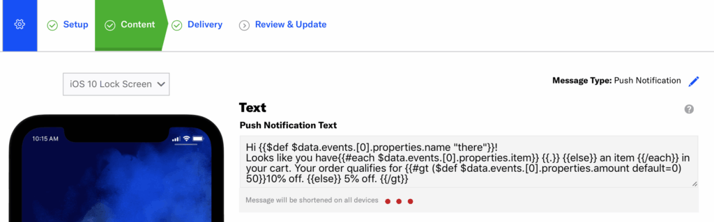 Using Airship, retailers can set up Custom Event Automations to trigger automatic responses to certain actions or events like cart abandonment.  Holiday shoppers can receive personalized push notifications, SMS messages, and emails in the moments that follow their ditched carts. This personalized message will remind the user about their abandoned cart and encourage them to make a purchase, bringing holiday cheer to them and to your brand.