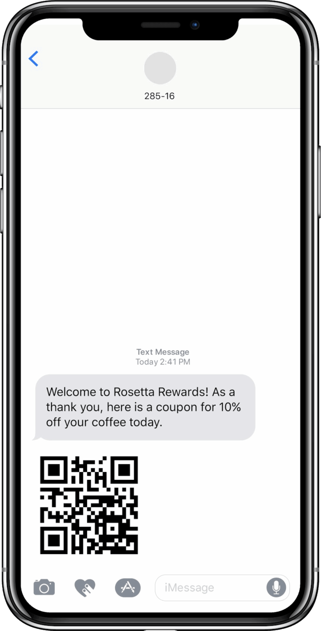 You can make it easier for your customers to join your loyalty program by using SMS keywords like “LOYALTY” or “REWARDS.” When your customer texts the keyword to your dedicated short code, you can set up a conversation flow that encourages opt-ins to your text or MMS messages. This creates a continuous communication channel with new loyalty members where you can engage them even further with GIFs and photos that will grab your customers’ attention. You can even send a coupon or QR code to welcome new loyalty members and drive that first purchase.