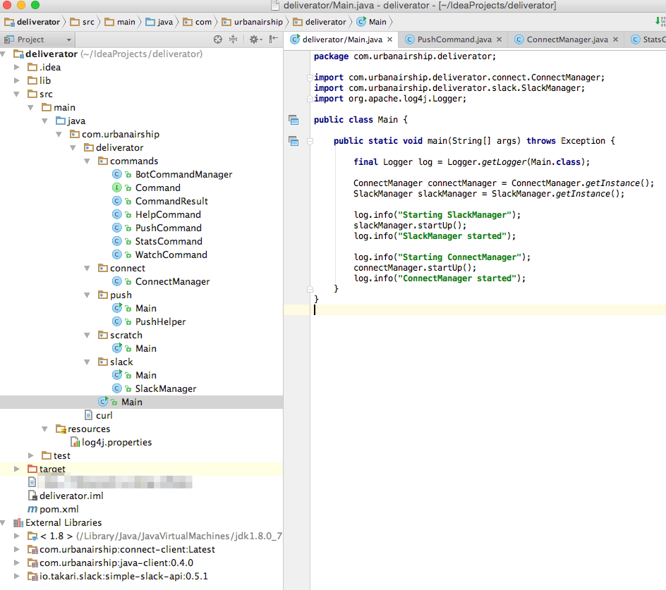 I wrote a lot of Java years ago so I figured I’d start there. I also used to use IntelliJ and it is even better than it was years ago so I set it up really quickly. Urban Airship Connect and Slack both have great libraries available. I used the Urban Airship Connect Java library to use Connect over the Connect HTTPS Streaming API, the Urban Airship Engage Java Library to use the HTTPS Push API and the Simple Slack API library.