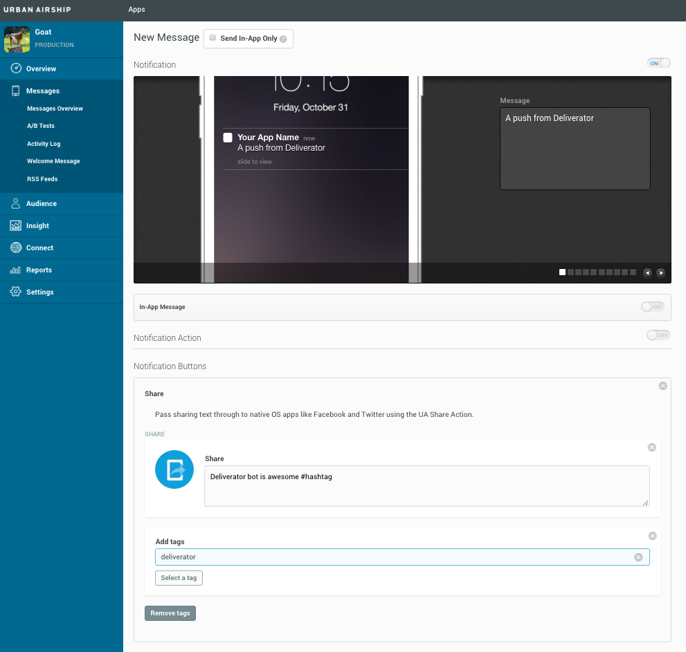 Last, I’ll watch my Named User for any events on any of my devices that have the Goat app installed. This could be really useful for testing or troubleshooting a user issue. To demonstrate it in action, I used our message composer to create a push notification with a social sharing button. It also sets a tag named “deliverator” if you tap the button. I included a screenshot of the composer interface and the on-device experience below.