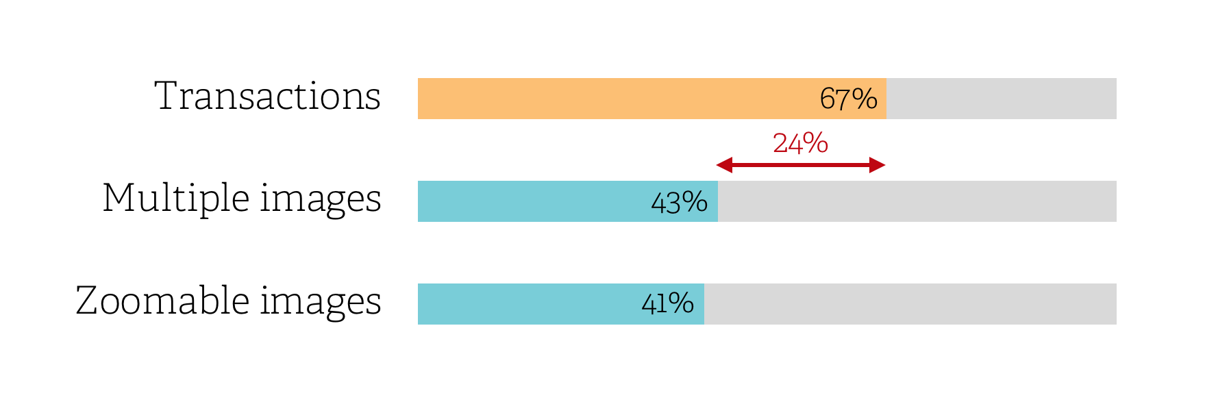 It’s not surprising that the majority of apps examined were transactional (67%), although not quite as many as you might expect. However, just over half of all apps don’t have more than one product image or the ability to zoom in on the images that are available on the product display pages (PDPs). This means that at least 24% of transactional apps don’t have the fundamental capabilities which have been shown to double conversion and triple engagement.
