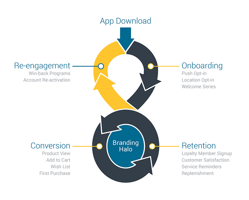 The mobile engagement loop takes advantage of the ongoing opportunity for growth and sustained engagement both inside and outside of apps through a cyclical, multi-tiered approach. It includes four stages: onboarding, conversion, retention and re-engagement. Each stage should not only be considered individually, but as part of a whole, for a comprehensive, thoughtful mobile engagement strategy that strengthen relationships with your customers.