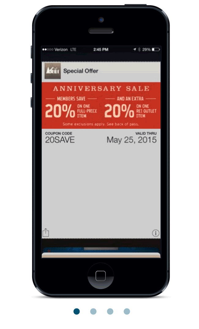 Above: REI’s mobile wallet coupon efforts show the dynamic engagement opportunity they offer.
