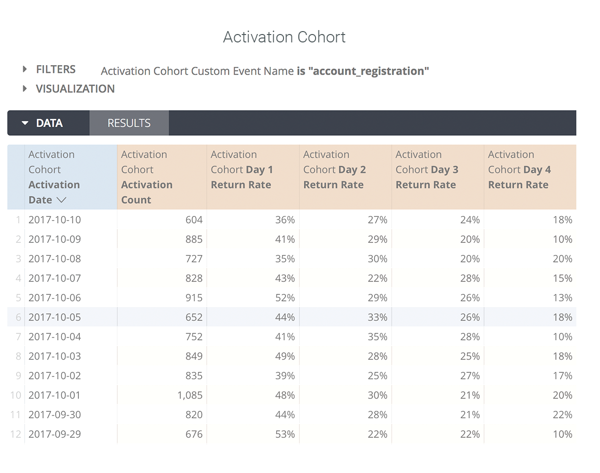 In this report, we take a look at 4 day retention and see the impact of a 3-part welcome series has on D1 and D3. Marketers and product owners can easily pinpoint how users are interacting with their welcome series starting on 10/1 and determine if updates to their welcome flow are having the desired effect.