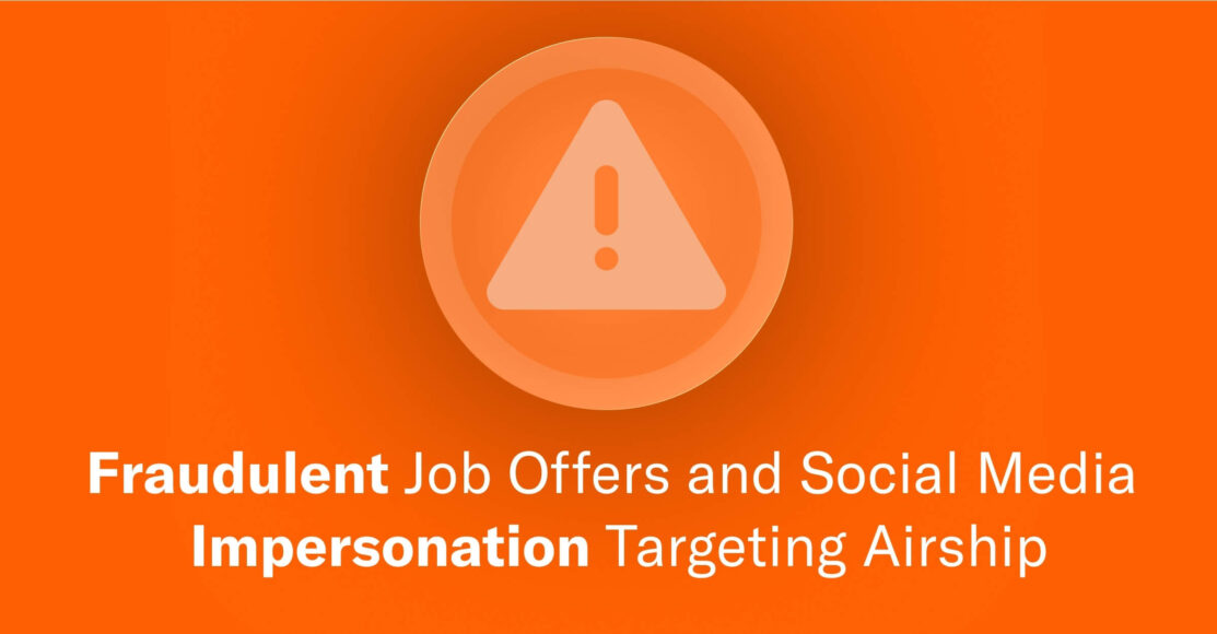 Airship has identified ongoing fraudulent activities involving scammers impersonating our company. These scammers are creating fake job opportunities and misusing Airship’s trademark to defraud unsuspecting individuals. Recently, we’ve observed scammers using “ARSwork” and “ARSworks” branding, but these tactics frequently evolve and change. Airship has no affiliation with any entity misrepresenting our brand, including but not limited to those using ARSwork/ARSworks branding.