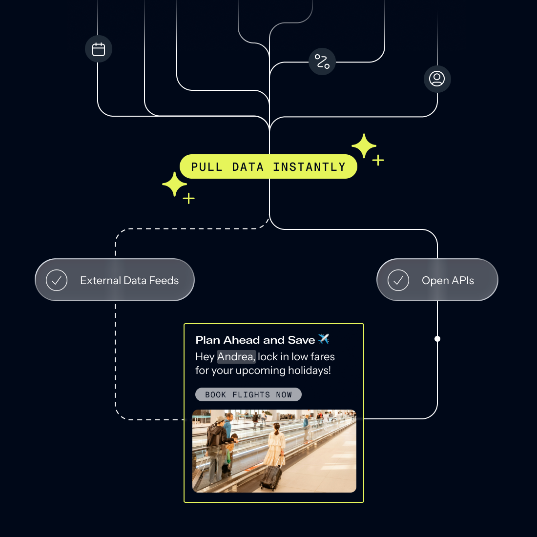Don't let data silos stop you. Use our open APIs and External Data Feeds (XDF) to pull personalization data from any source directly into your campaigns.