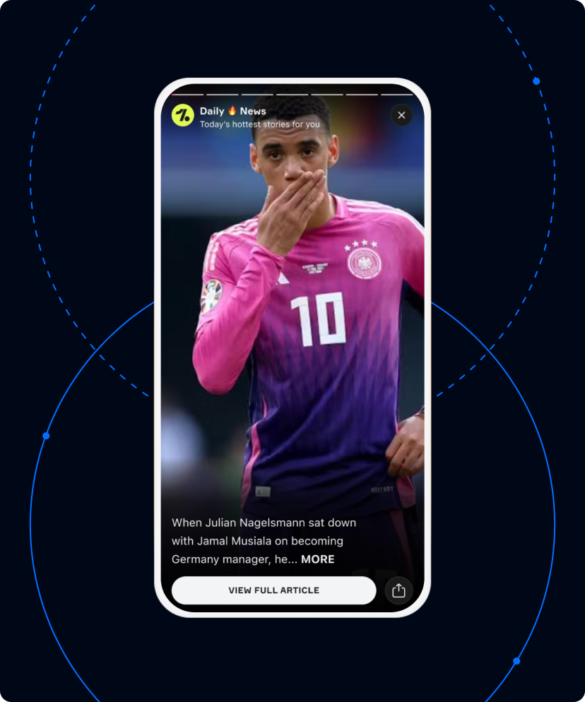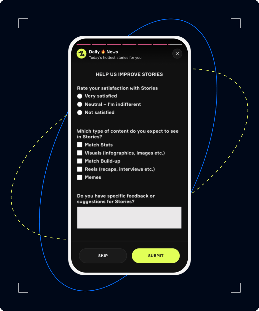 Building on the success of the Wrap-Up, OneFootball launched Daily Digest, which offered a variety of snackable content in a vertical format similar to Instagram Stories. Customers could then interact with the content through dedicated buttons that allowed them to share, react, or explore more. To continuously optimize their approach, OneFootball utilized A/B testing and also gathered customer feedback using targeted Surveys.