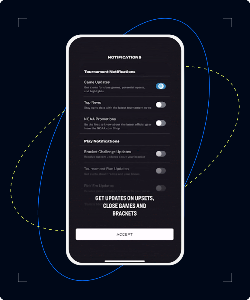 Push notifications were central to TNT Sports’s March Madness app experience, emphasizing special alerts for bracket picks, game starts, and must-see moments. The team knew that a well-planned onboarding experience was key to setting themselves up for success during the tournament itself. With Airship’s app experiences, TNT Sports emphasized the value and importance of opting-in to push notifications from the beginning, paving the way for richer experiences throughout the tournament.