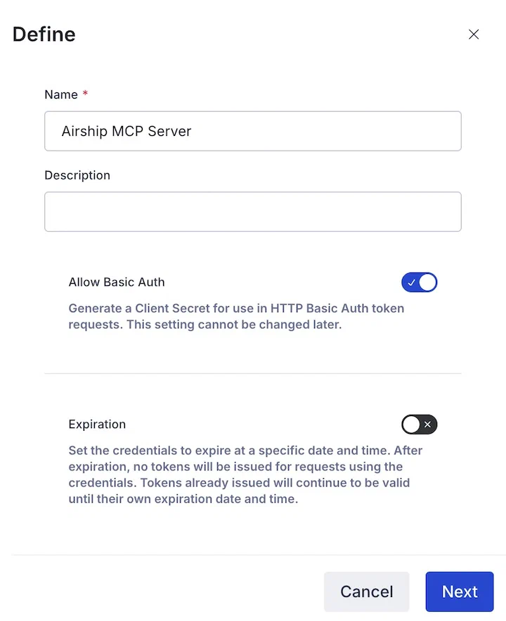 You are responsible for securing your OAuth 2.0 credentials. Do not share credentials, commit them to version control, or expose them in prompts or public repositories. Airship is not responsible for any consequences arising from compromised, misconfigured, or overly permissive credentials.