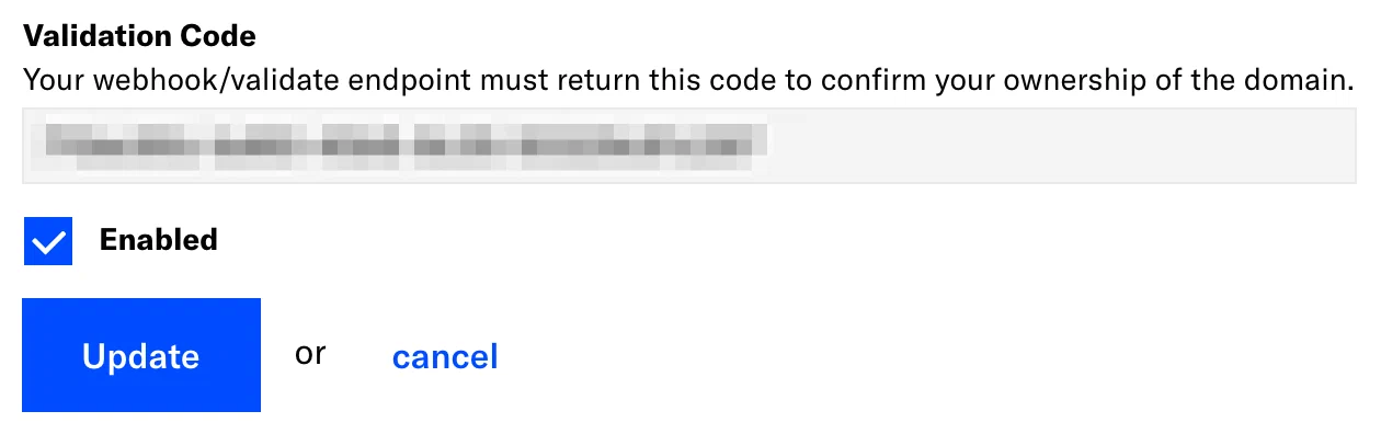 After saving, a Validation Code field appears, containing a 36-character UUID. This code must be returned by the webhook server at