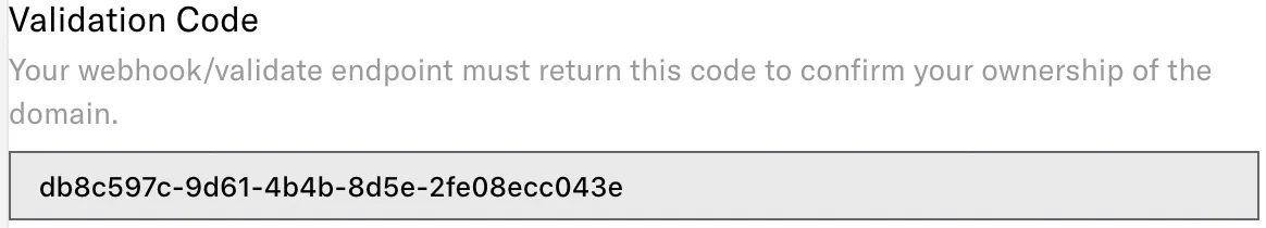 When you register a webhook in the Airship dashboard, Airship returns a Validation Code. You must set up your webhook to respond to GET requests to a /validate endpoint with a confirmation_code key containing this value before you enable the webhook in Airship.