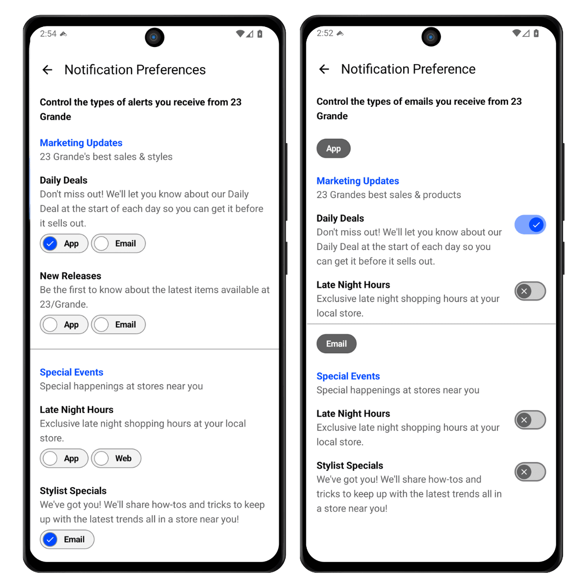 You can customize the appearance of the Preference Center to match your app’s style. Android supports theme customization through both Jetpack Compose and XML Views.