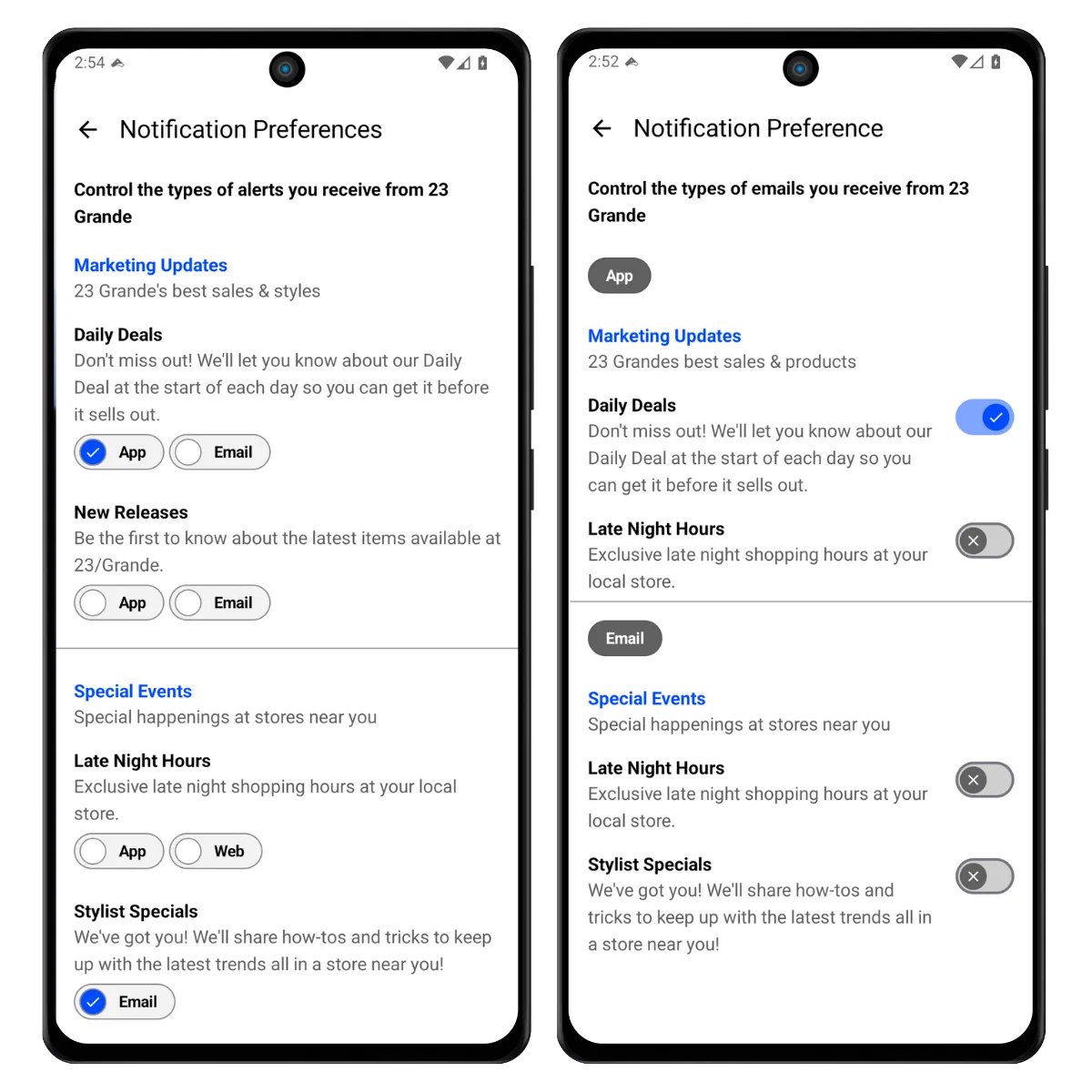 Display a Preference Center with a single method call. The Preference Center will be launched in its own Activity over your app, allowing users to manage their subscription preferences, and automatically syncing changes with Airship.