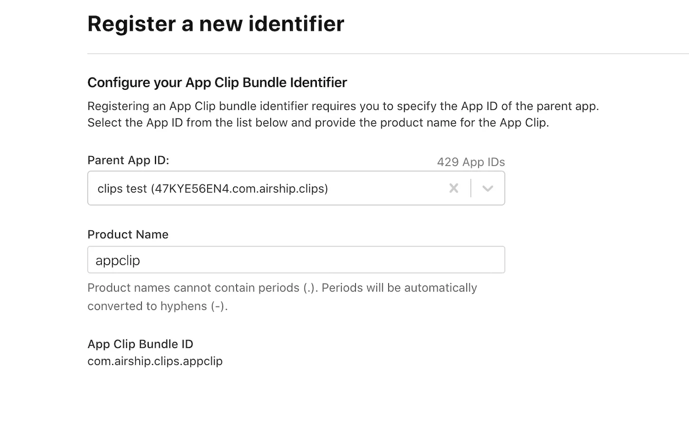 An App Clip requires a separate application identifier in the Apple Developer Portal and a separate project in the Airship dashboard. You need to follow the same setup steps required for the main application in both the Apple Developer Portal and the Airship dashboard.