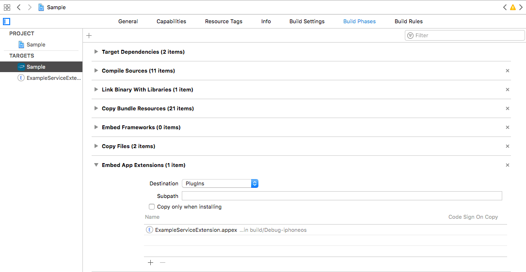 - Verify that your app target’s Embed App Extensions includes the newly created extension.