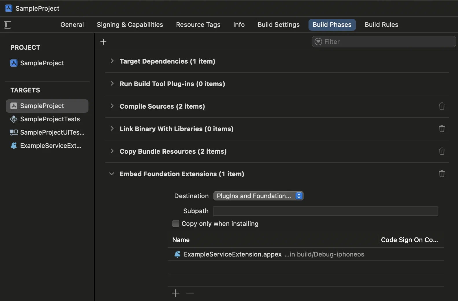 - Verify that your app target’s Embed App Extensions includes the newly created extension.