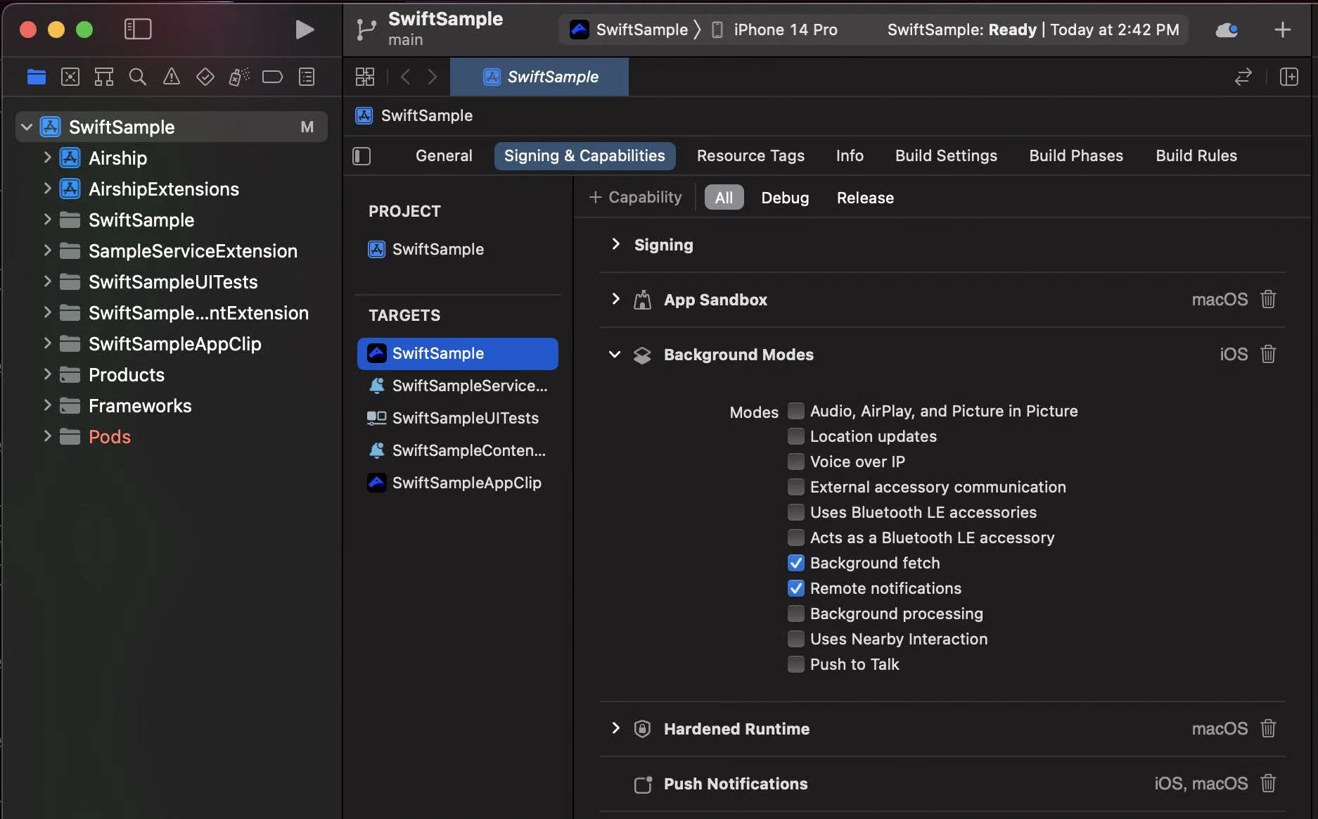 In the Background Modes section, select the Remote notifications checkbox.
