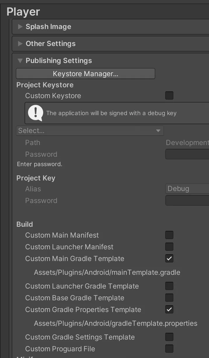 Go to Project Settings, then Player, then Android, then Publishing Settings, then Build, and then select Custom Main Gradle Template and Custom Gradle Properties Template.