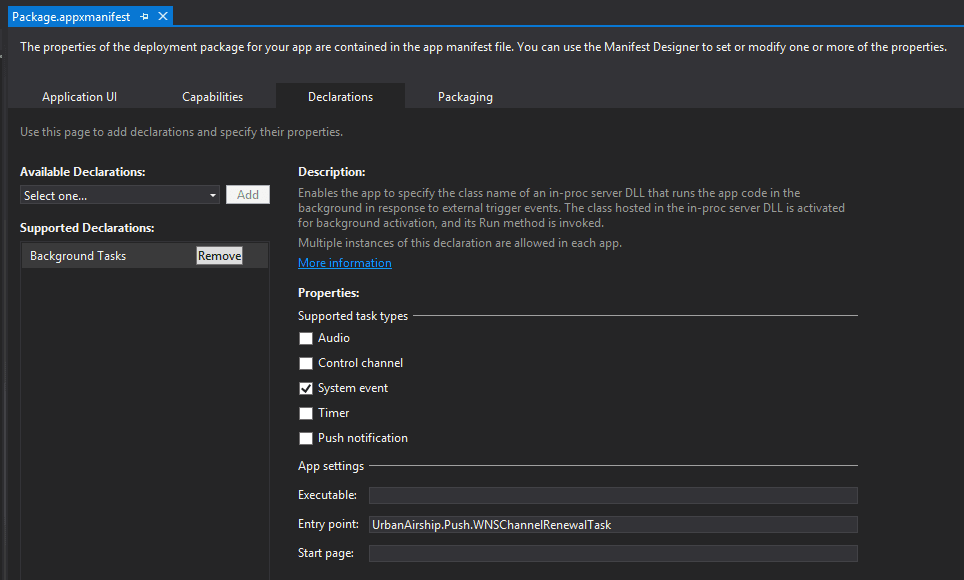Package.appxmanifest). - On the Declarations tab, Add a Background Task.