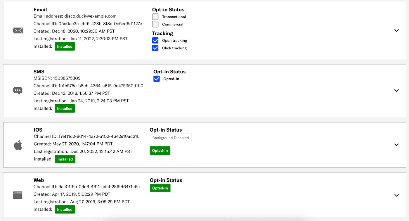 - App, Web, and Open channels display Opted-In or Opted-Out. Background Enabled or Background Disabled appears for App channel background push.