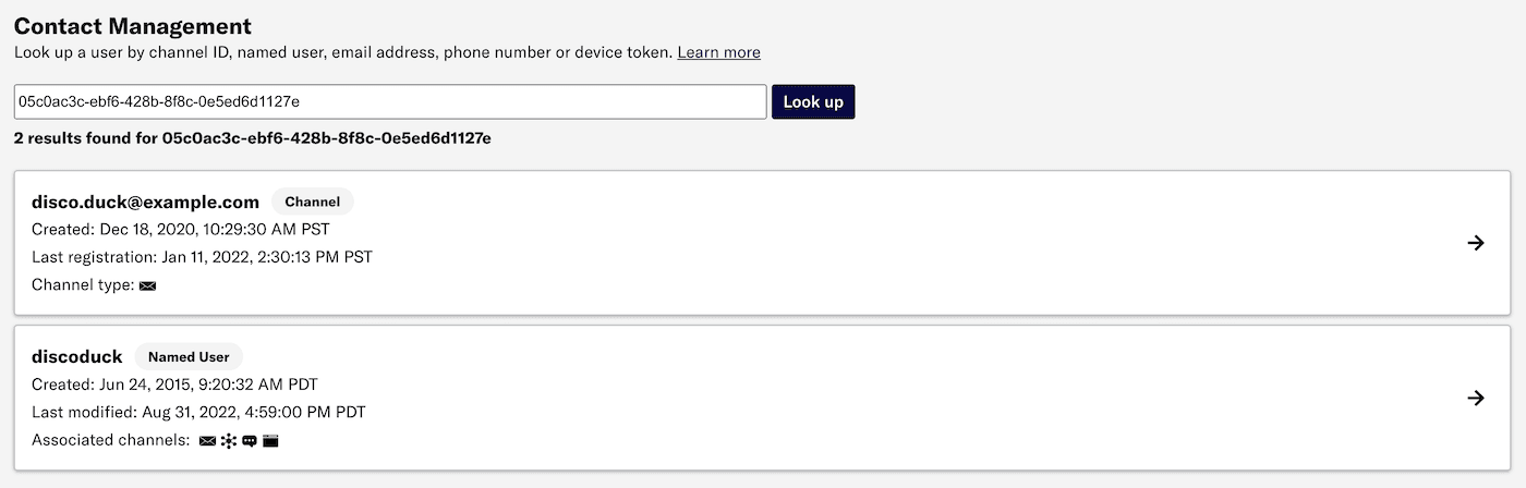 You can use the contact management tool to view details about specific contacts and remove channels and contacts from your Airship records.