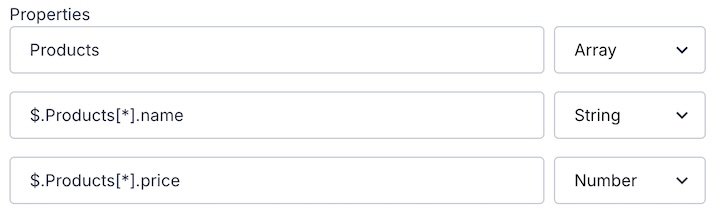 Productsof type Array, to acknowledge the array itself$.Products[*].nameof type String, for segmentation using the name of any product in the array$.Products[*].priceof type Number, for segmentation using the price of any product in the array