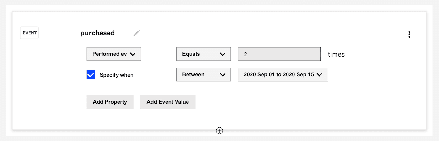 - (Optional) Click Specify when to target when the event was performed, then select an operator and configure a date or range. Availability and requirements depend on the operator.