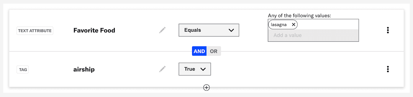 Text and Number attributes — Click Add a value and enter a value in text or number format, then click outside the field or hit Enter on your keyboard to save the value. Repeat for multiple values. Multiple values are evaluated as a boolean OR.