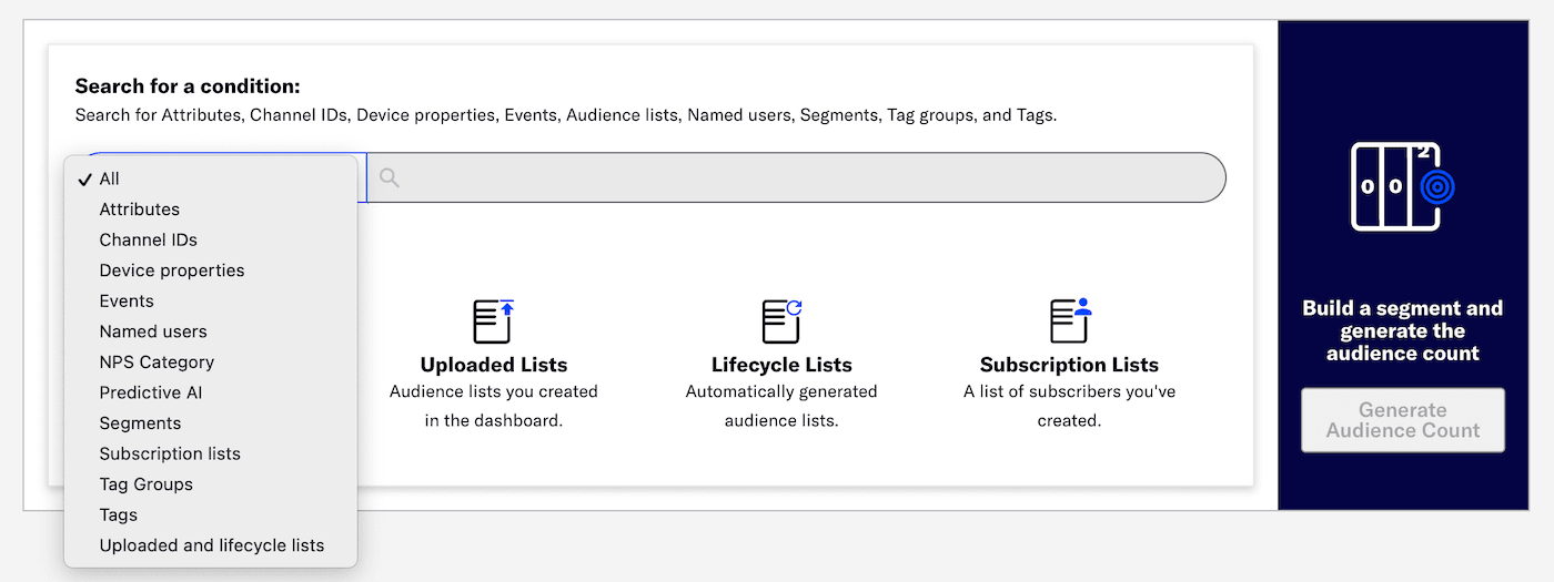 You can select from your 10 most recently created or modified segments, Uploaded listsA reusable audience list that you create. Uploaded lists are static and updatable. In the API, they are referred to as Static Lists., and Subscription listsAn audience list of users who are opted in to messaging about a specific topic. Users can manage their opt-in status per list using a Preference Center., and all your Lifecycle listsAutomatically generated audience lists that capture app open, uninstall, notification, and dormancy information within the past 24 hours, one week, or 30 days..