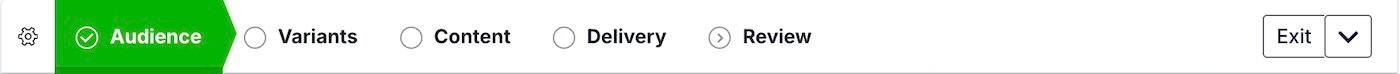 Option Description Steps All Users Your entire audience for the selected channels n/a Target Specific Users Audience members in a group you define Use the same procedure as Building Segments. Test Users Members of a Test GroupA preview group is audience group used for previewing personalized content in the dashboard. Wherever a personalization preview is available, you can select a preview group, and its group members’ attributes will appear for any Handlebars references to attributes. You can enable any preview group as a test group so you can send test messages to its group members. These messages appear as tests in Messages Overview. Select a Test Group. Select the Variants step, then select the number of variants you want to create and set the percentage of your target audience to test. By default we send your test to 80% of your target audience, keeping a control group of 20%. You can change the number of variants later.