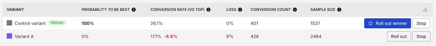 - Transparent decision-making — You can see whether a variant is performing better than others and the confidence in that result.